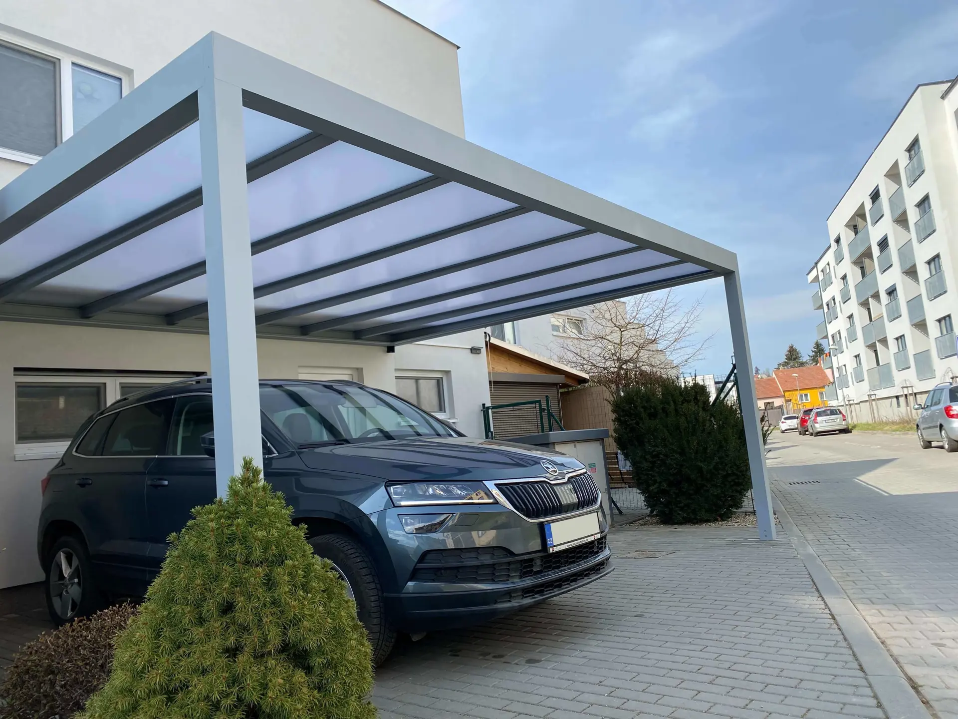 Veľkou výhodou je možnosť doplnenia o hliníkové bočné rolety, pevné lamelové výplne alebo integrované osvetlenie. Vďaka tomu sa z prístrešku stáva nielen ochrana vozidla, ale aj architektonický prvok, ktorý ladí s domom a záhradou.